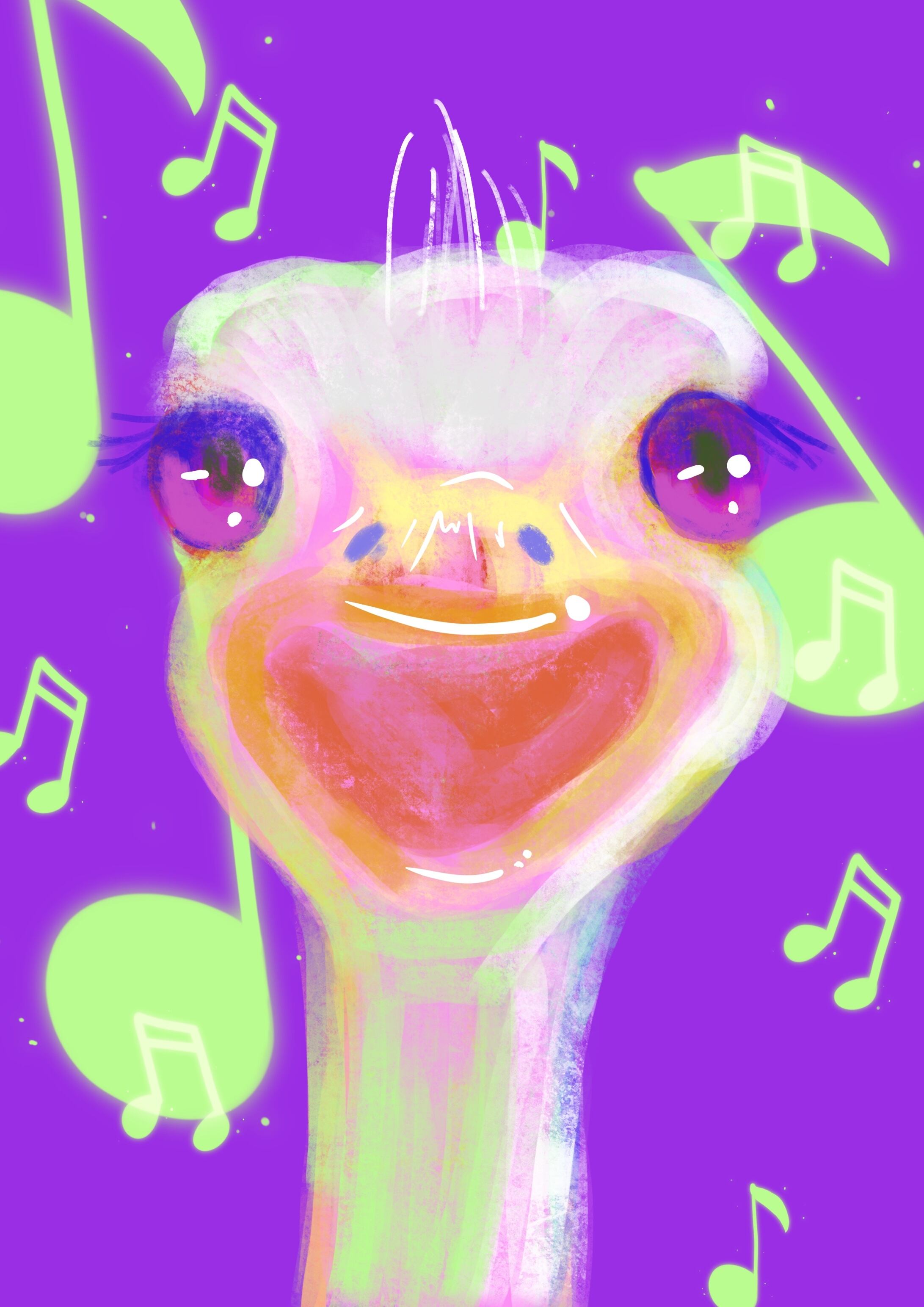 歌っているようなユニークな表情のダチョウをイラストにしました。