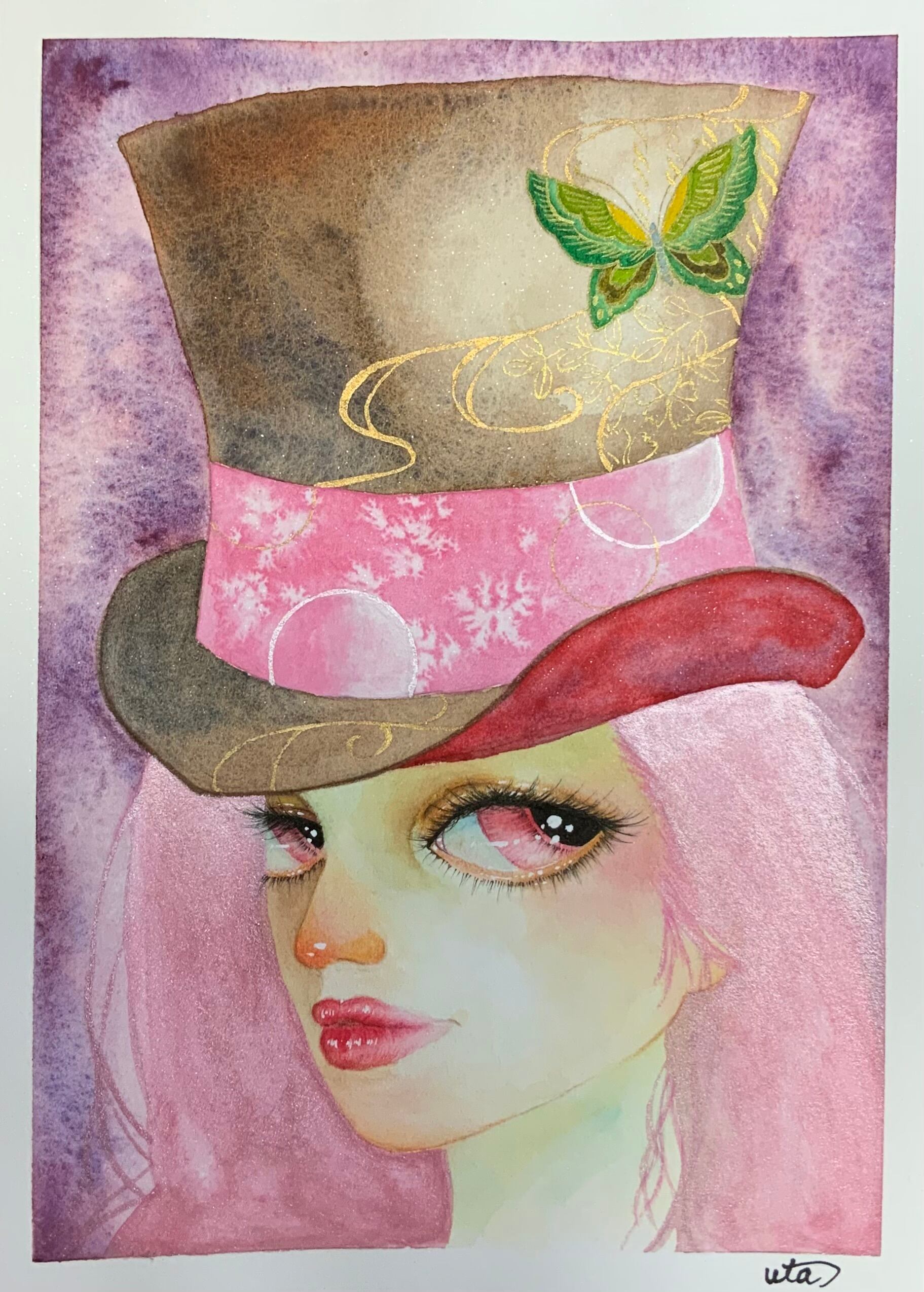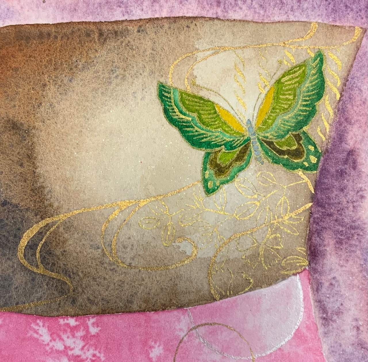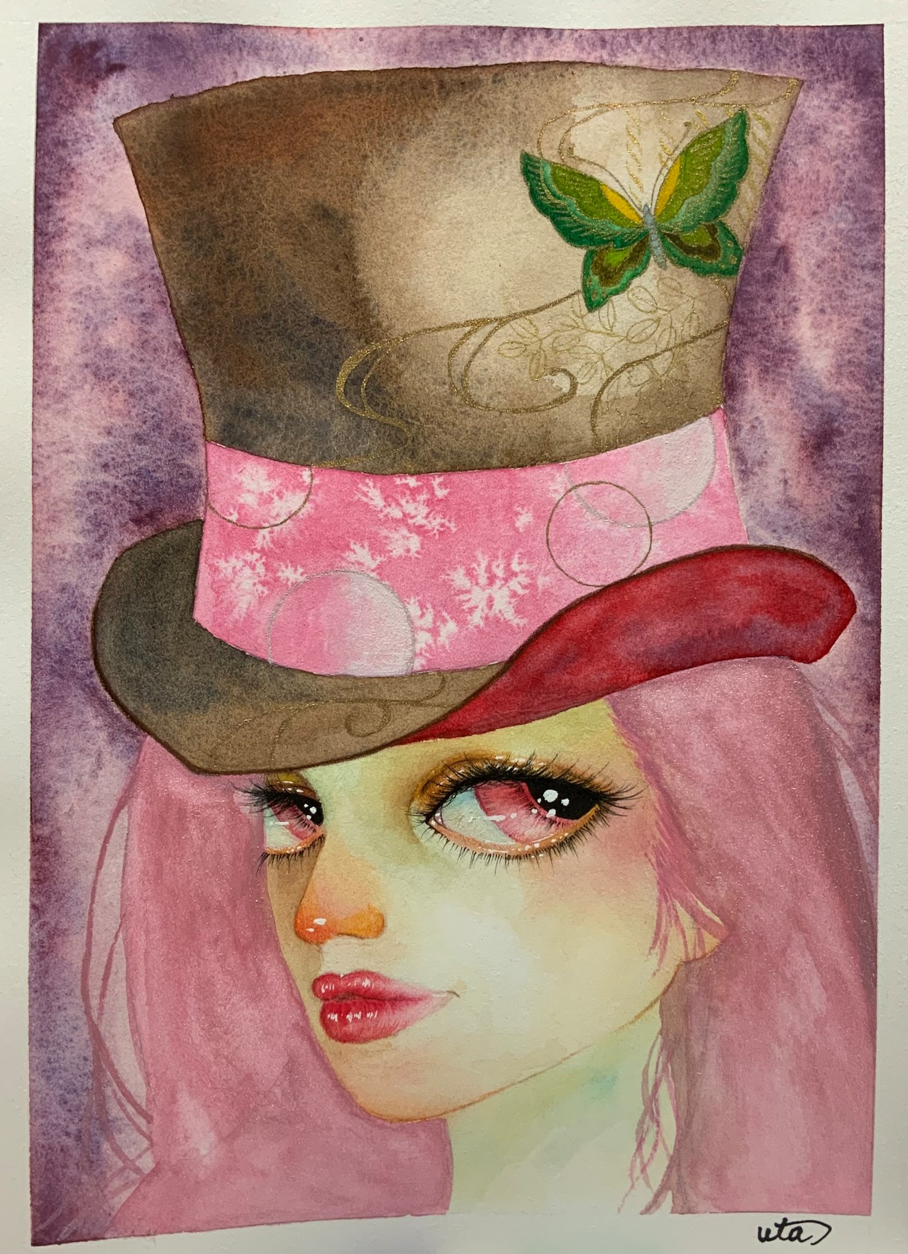 パールやラメ素材の画材で描いている部分は角度によって色が違って見えます。