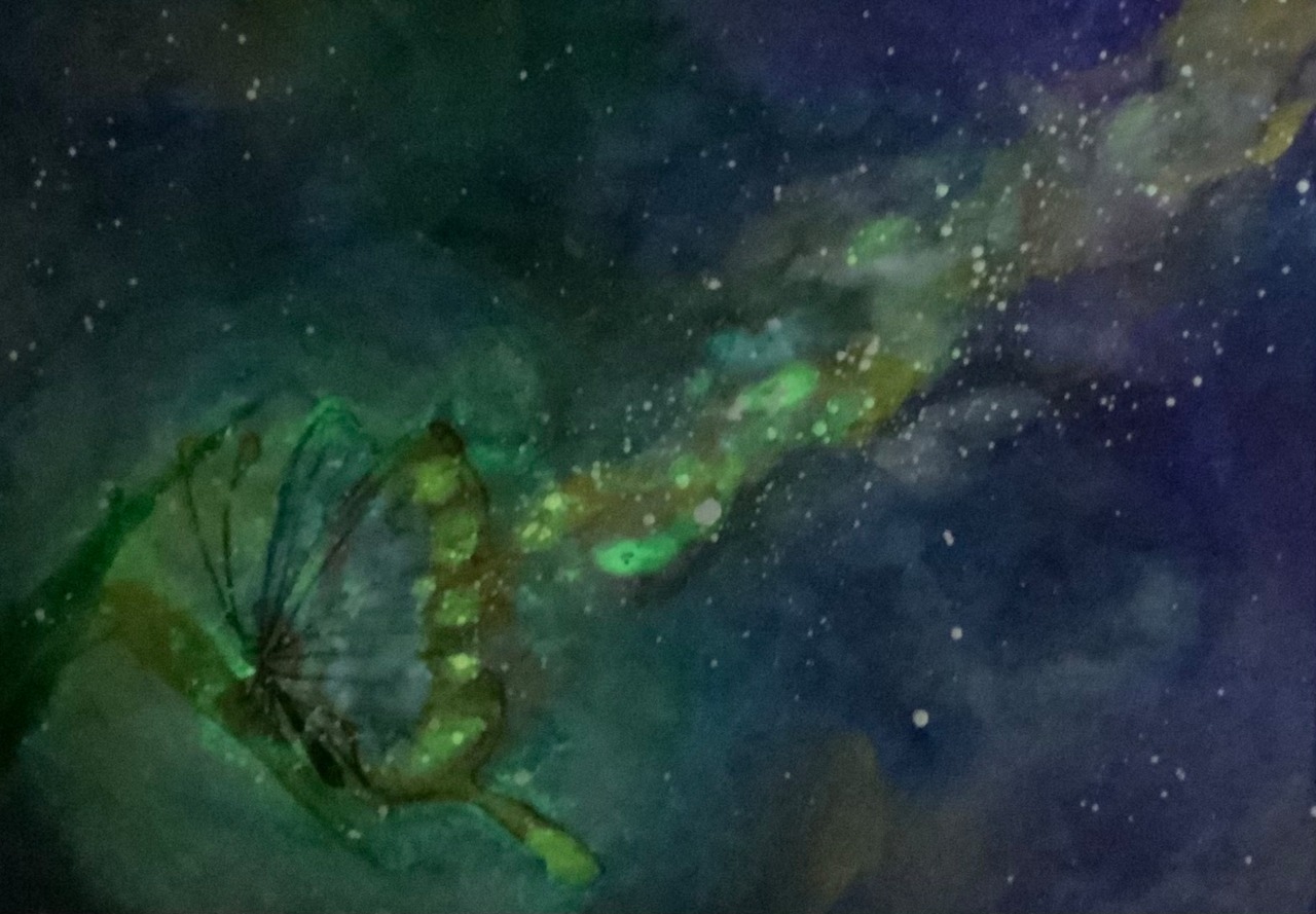 水彩紙に水彩絵具、ラメ・パールなどで描いた作品です。